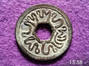 Identitas Denominasi/Berat (“Ta”). Sebagian besar koin emas awal ditandai dengan huruf “ta” (ta) dalam aksara Nagari, yang dianggap sebagai singkatan dari tahil, satuan berat mata uang pada masa itu.
