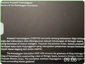 Prasasti kamalagyan di Krian ini bercerita tentang kebesaran Raja Airlangga (Raja dari Kahuripan) atas dibangunnya sebuah bendungan di Wringin Sapta, yang berlokasi di Dusun Klagen, Tropodo, Kecamatan Krian Kabupaten Sidoarjo. Narasi ini disematkan untuk keterangan Replika Prasasti Kamalagyan.