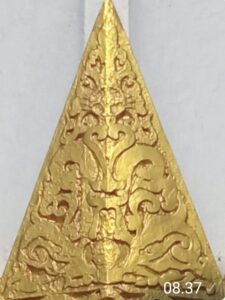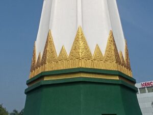 Gambar Trisula itu ada pada sejumlah gunungan segitiga berwarna emas pada pangkal Tugu.