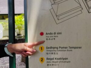Ironis ketika di lingkungan dalam keraton justru yang disajikan adalah aksara tradisional bangsa lain. Yaitu aksara Latin dan Tionghoa. Sementara aksara daerahnya sendiri (Jawa) tidak ada. Akan lebih bijak bila aksara Jawa menyertainya: ada Jawa, Latin dan Mandarin (Tionghoa).