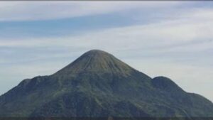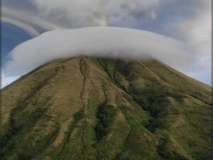 Ku tatap ketinggian di atas awan itu dari kejauhan. Bentuknya indah mengerucut menggapai langit yang bermahkota awan lentikular atau umum disebut awan topi.