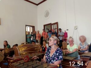 Tak menyia nyiakan kesempatan, mereka juga diajak menabuh gamelan. Ada pengalaman baru bagi mereka karena selama ini mereka hanya tahu dari cerita dan menonton atraksi wayang kulit lewat layar kaca.