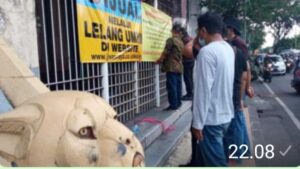 Peringatan itu berupa spanduk yang ditempelkan di sebelah spanduk yang berisi informasi penjualan melalui skema lelang.